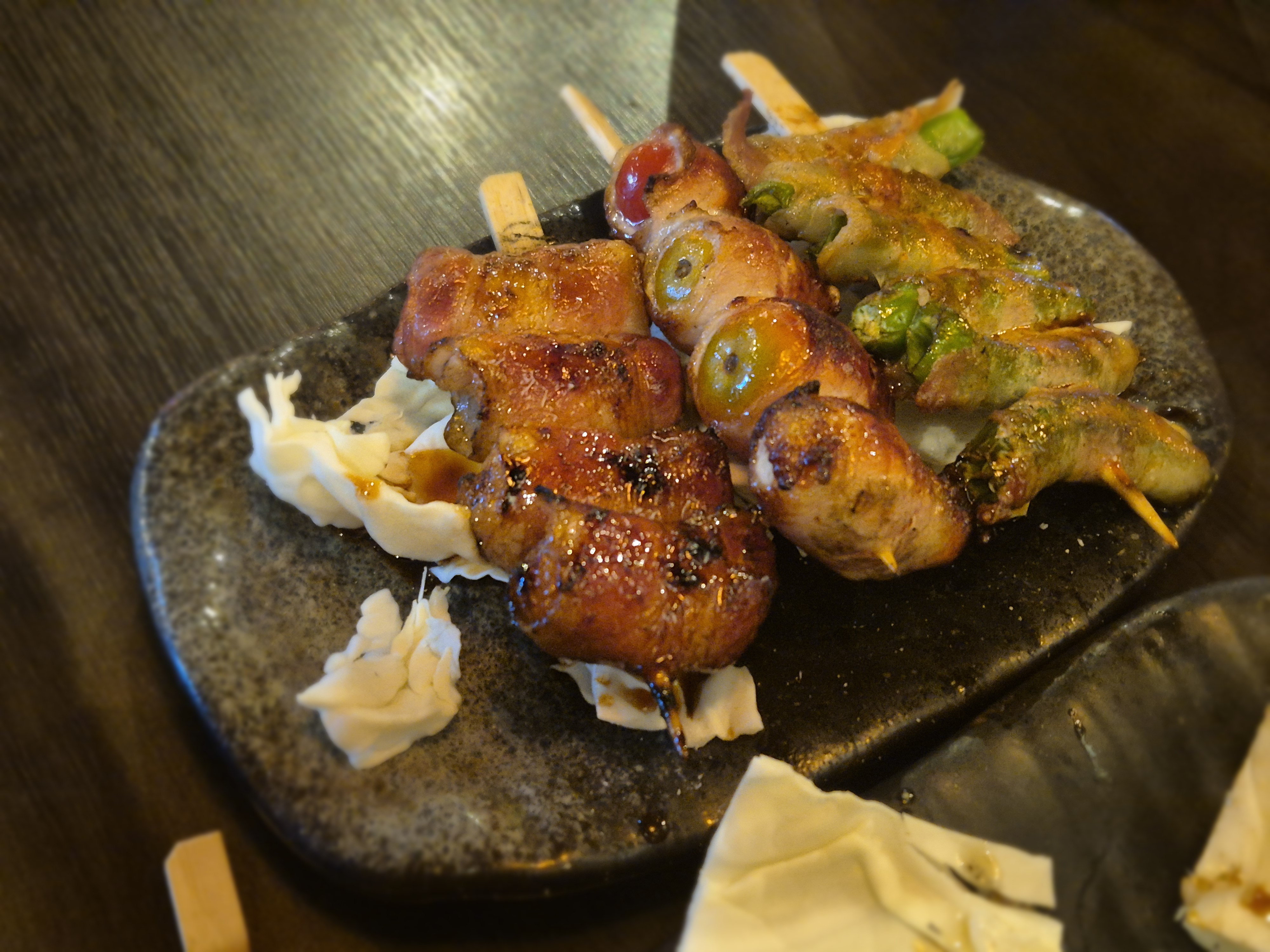 연어와 삼겹살 토마토삼겹 꽈리고추삼겹 관자베이컨을 시켰는데 먼저나온 삽겹살과 연어가 진짜 풍미가 예술이다. 특히 삼겹살에는 숯불향이 은은하게 배여 적당하게 익어서 씹을 때마다 엄청난 풍미가 느껴졌다. 연어도 엄청 큼지막한 조각으로 구워줘서 입안 가득 넣고 씹은 재미가 있다.